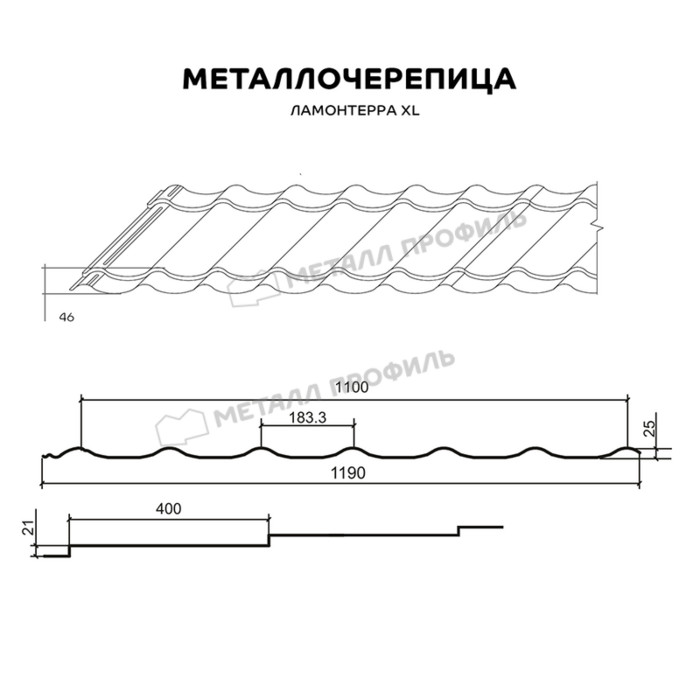 Если вы хотите купить классическую металлочерепицу для крупных скатов, обратите внимание на Ламонтерра® XL. Она отличается увеличенными габаритами: длина ступеней — 400 мм, а высота — 21 мм. Крупные асимметричные волны акцентируют размеры скатов и сделают крышу более оригинальной.